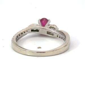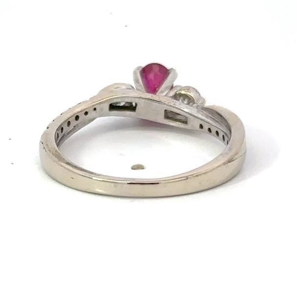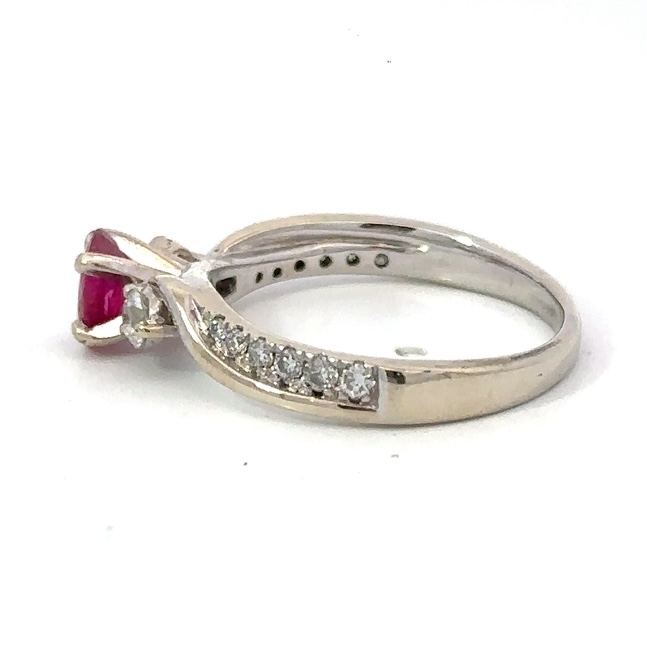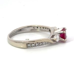 This ruby ring with diamonds is a beautiful piece to add to your collection. Ring weighs 3.5 grams. 14k white gold. Ring size 7 1/2.
