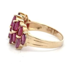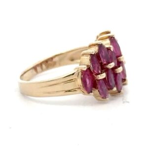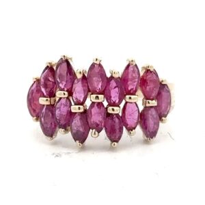 This lady’s estate ring features 2 carats of rubies. They are mounted in 3.8 grams of 14k yellow gold. Ring size 6.75.