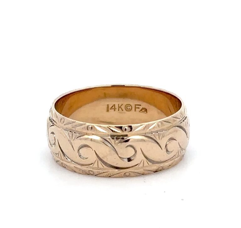 This men’s estate 8mm carved band is made of 6.7 grams of 14k yellow gold. Ring size 9.