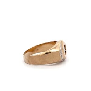 This men’s estate ring features a .33 carat diamond, clarity SI, and color H-I. It is mounted in 9.1 grams of 14k yellow gold. Ring size 11 1/2.