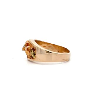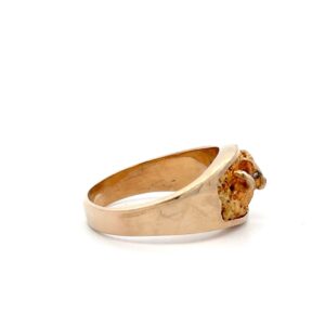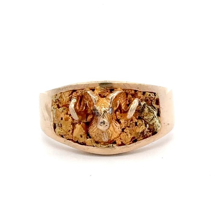This men’s estate 10k ring features natural gold nugget inlay with a ram head in the center that has diamond eyes. It weighs 13.8 grams. Ring size 13.