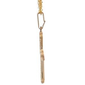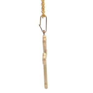 This estate pendant features a 0.7 gram 14k hollow cross. This piece is approximately an inch tall & 2/3’s of an inch across. This piece comes with a gold-plated chain.