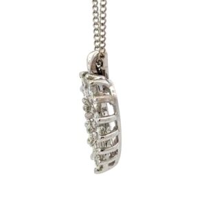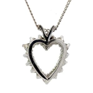 This estate heart pendant has .56ct diamonds. They are mounted in a 4.5-gram 14k white gold setting. This piece is just under an inch tall and includes an 18-inch, 14k white gold chain.