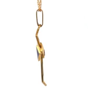 This estate pendant features a cross with blue enamel tips. It is mounted in a 4.3-gram 18k setting. This pendant is approximately 30 x 20mm. It comes with a gold-plated chain.