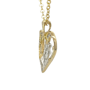 This “Mother & Child” heart is made of 10 karat yellow and white gold. It is over 3/4″ tall and has .21 carat total weight of natural diamonds. It weighs 1.9 grams. This pendant comes with a gold plated chain at no charge, we have a nice variety of gold chains if you need one.