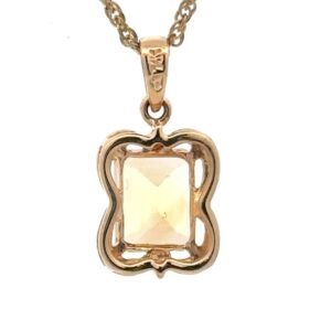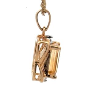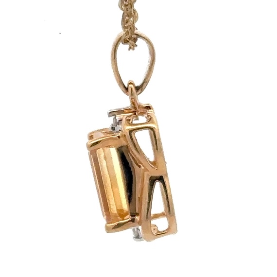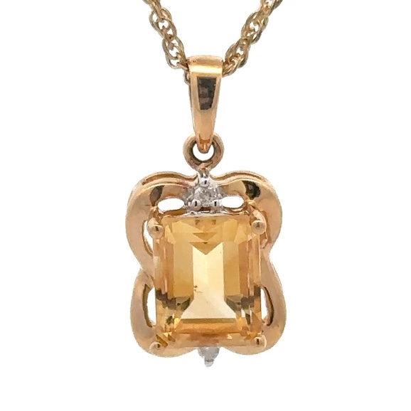 This estate pendant features a 2.50ct citrine. It is mounted in a 2.1 gram 14k gold setting. It is approximately 18mm tall and 7mm wide. This piece comes with a display chain.