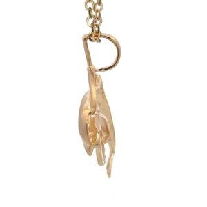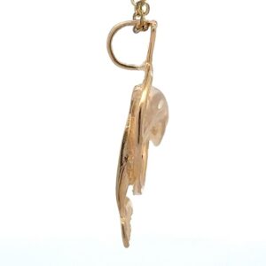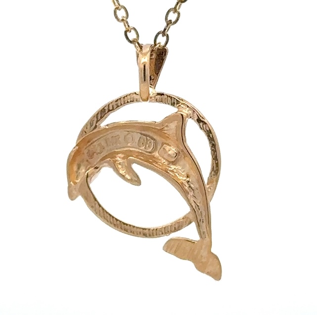 This estate pendant features a dolphin. It is mounted in a 2.2 gram 14k setting. It is approximately 18mm tall and 14mm wide. This piece comes with a gold-plated display chain.