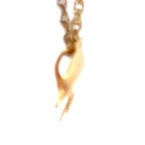 This estate pendant features a dolphin. It is mounted in a 0.4-gram 14k setting. This piece is approximately 5mm tall. This piece also features a gold-plated display chain.