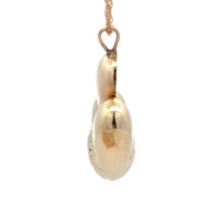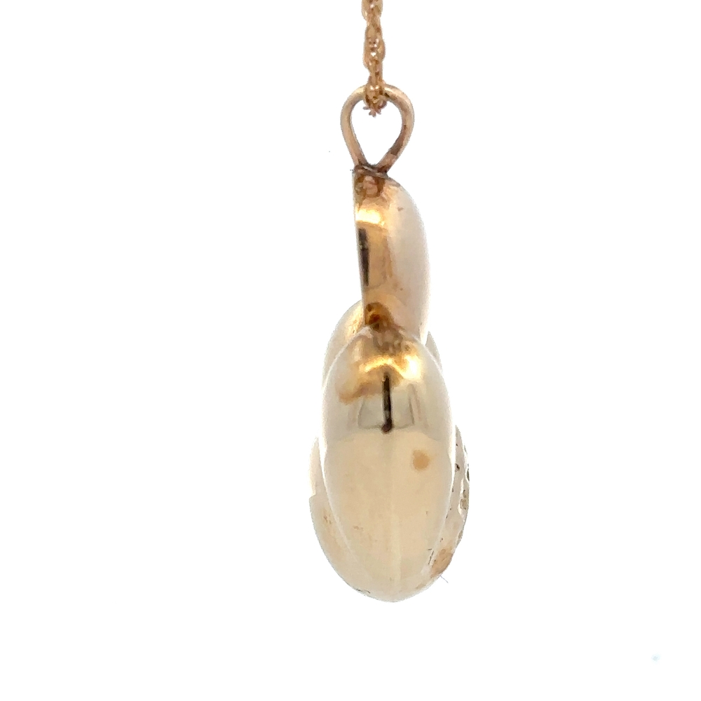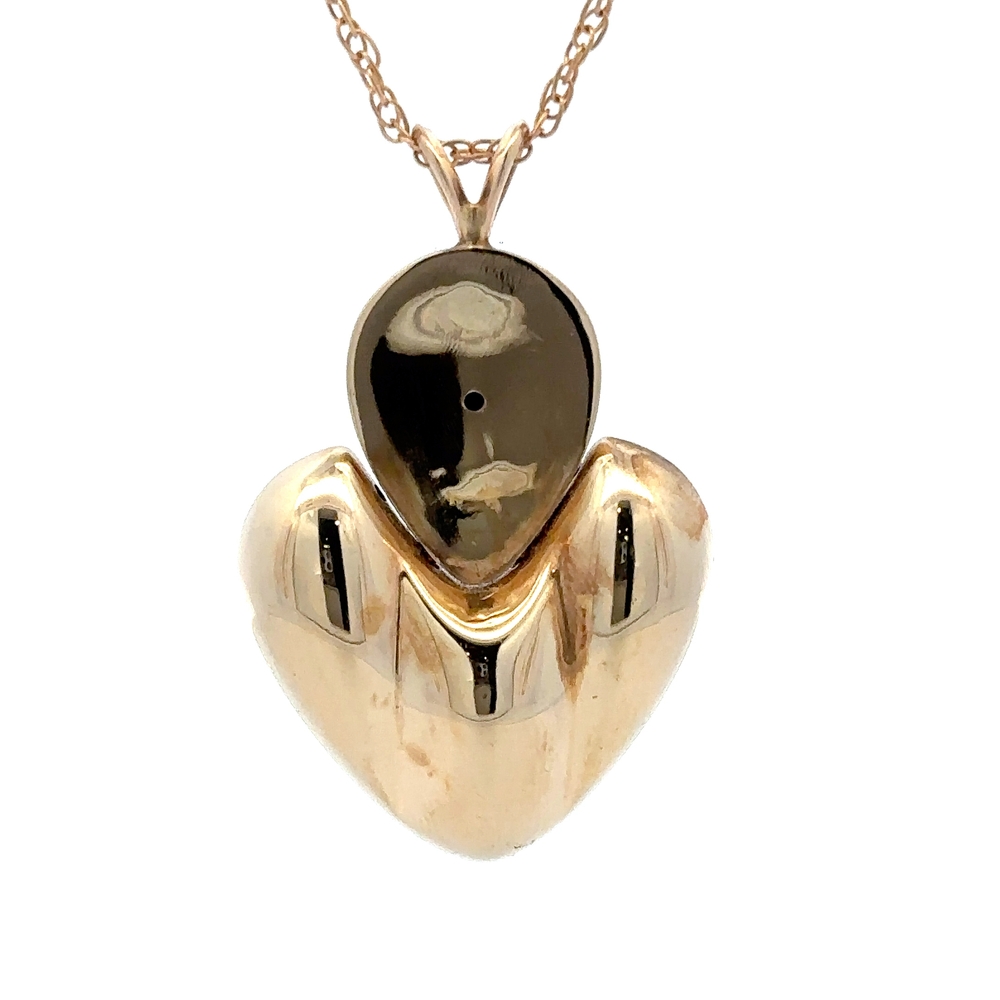 This estate pendant is mounted in a 4.8 gram 14k setting. It is approximately 35mm tall and 22mm wide. This piece comes with a gold-plated display chain.