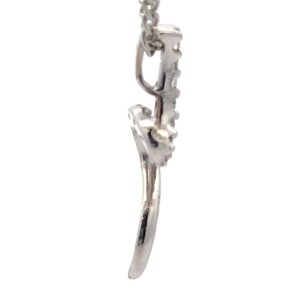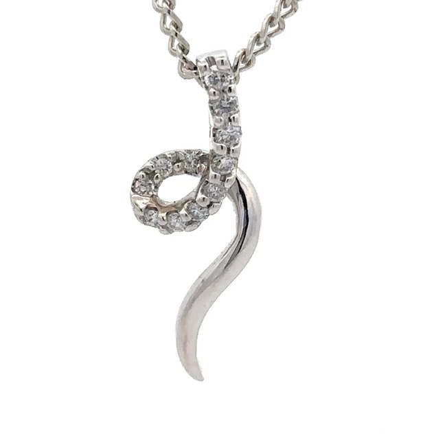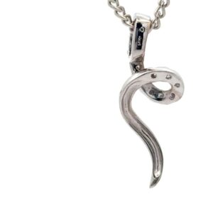 This estate pendant features a fluid swirl. It is made with a 1.2 gram 14k setting. It is approximately 20mm tall and 5mm wide at its widest point. This piece comes with a silver colored display chain.