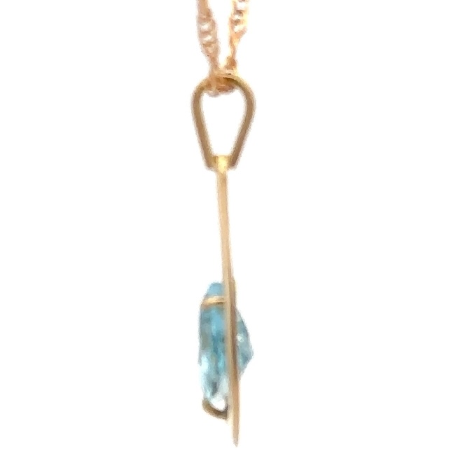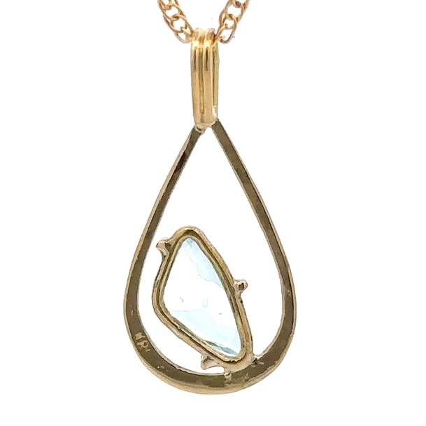 This estate pendant features a 1.04ct aquamarine. It is mounted in a 1.3 gram 18k setting. It is approximately 23mm tall and 9mm wide. This piece comes with a gold-plated display chain.