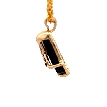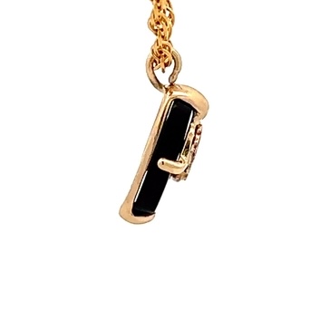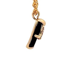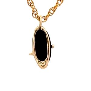 This estate pendant features black hills gold & black onyx. It is mounted in a 1.1 gram 10k setting. It is approximately 14mm tall and 4mm wide.
