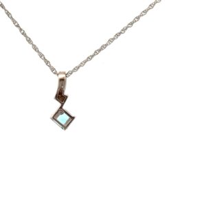 This estate pendant features a blue topaz accompanied by .075ct diamonds. It is mounted in a 1.7 gram 14k white gold setting. It is about 3/4 inch tall.