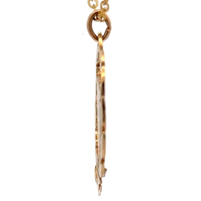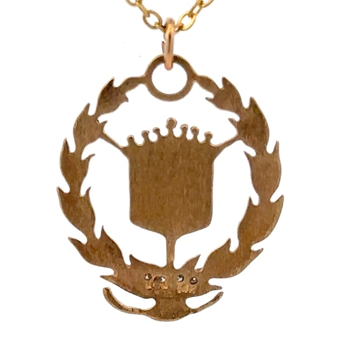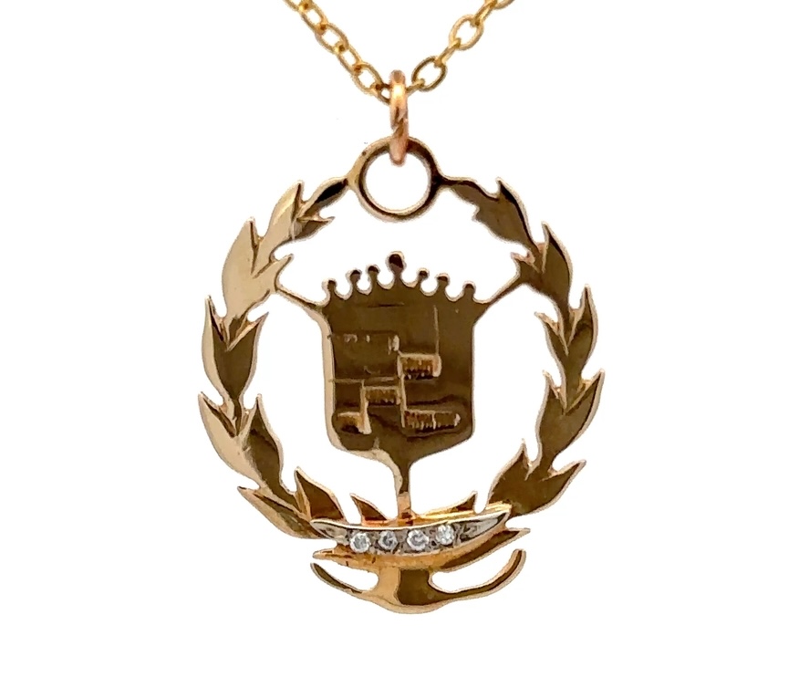 This estate pendant features the Cadillac logo. It has .02ct diamonds. It is mounted in a 2.2 gram 14k setting. It is approximately 23mm tall and 19mm wide.