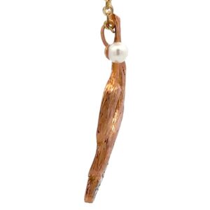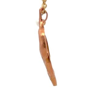 This estate pendant features a 3.40mm pearl. It has .04ct diamonds, with a clarity of SI, and a color of G-H. It is mounted in a 2.7 gram 14k setting. It is approximately 28mm tall and 10mm wide. This piece comes with a gold-plated display chain.