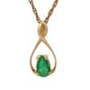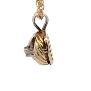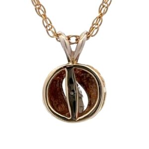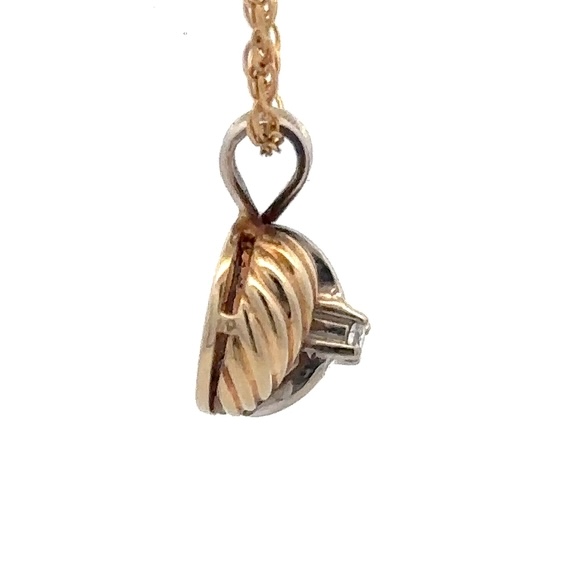 This estate pendant features a .03ct diamond, with a clarity of SI, and a color of G. It is mounted in a 1.8 gram 10k setting. It is approximately 11mm tall and 7mm wide. This piece comes with a gold-plated display chain.