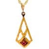 This estate pendant features a gold nugget. It has .70ct garnet. It is mounted in a 3.1-gram raw gold nugget. This piece is approximately 19mm tall. This piece comes with a gold-plated display chain.