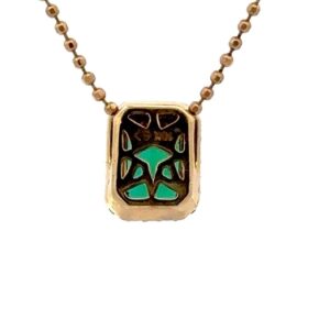 This estate pendant features a synthetic stone. It is mounted in a 2.4 gram 10k setting. It is approximately 6mm tall and 4mm wide. This piece comes with a 16″, 10K beaded chain.