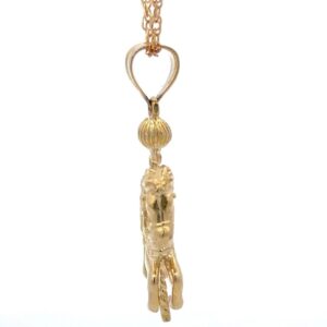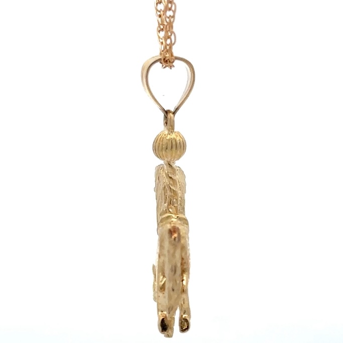 This estate pendant features a carousel horse. It is cast out 8.3 grams of 14k gold. This piece is approximately an inch and a half tall & an inch across.