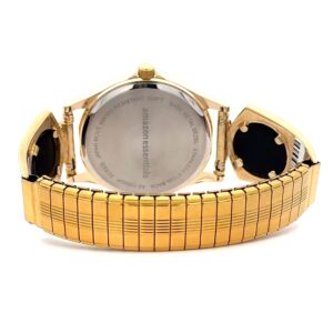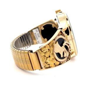 This gorgeous Amazon Essentials gold nugget watch is covered with Alaskan gold nuggets and is a nice, sleek design that is classy while not being too flashy or gaudy. It is nice and slim and has a low profile while you are wearing it. This watch face is on a nice stretch watch band. The inserts are fully covered in Alaskan gold nuggets and feature two black onyx circles with gold caribous on either side.