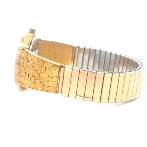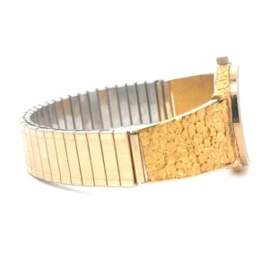 This gorgeous Bulova Accutron gold nugget watch is covered with Alaskan gold nuggets and is a nice, sleek design that is classy while not being too flashy or gaudy. It is nice and slim and has a low profile while you are wearing it. This watch face is on a stretch watch band. The insert on this watch is fully covered in Alaska gold nuggets.