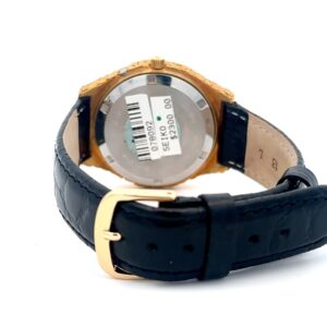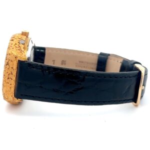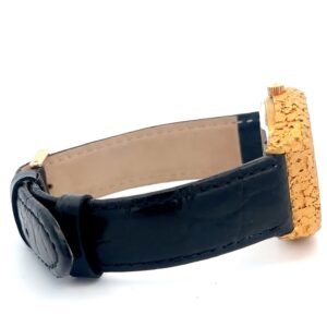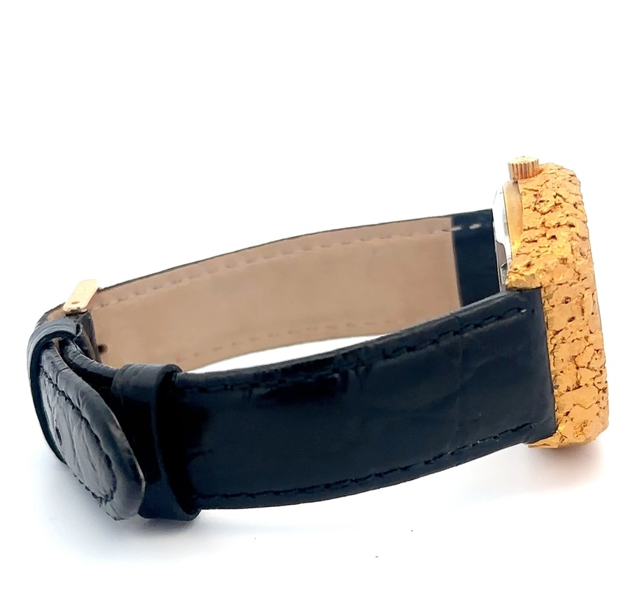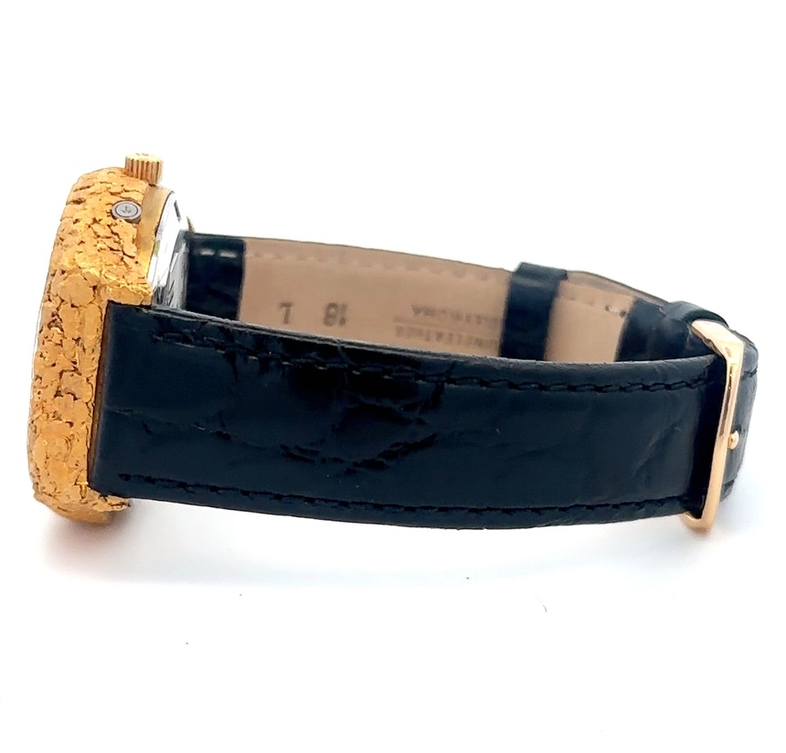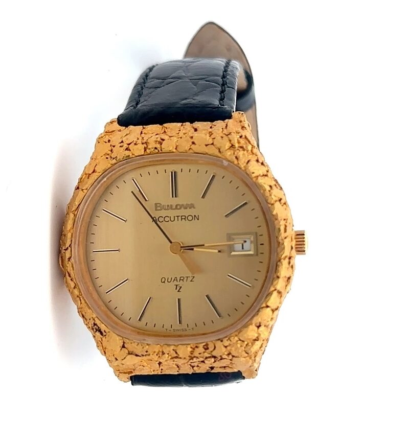 This gorgeous Alaskan Bulova Accutron gold nugget watch is covered with Alaskan gold nuggets and is a nice, sleek design that is classy while not being too flashy or gaudy. It is nice and slim and has a low profile while you are wearing it. This watch face is on a nice leather watch band.