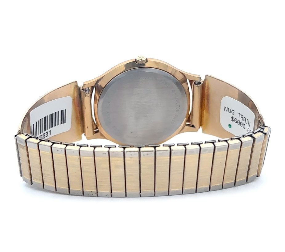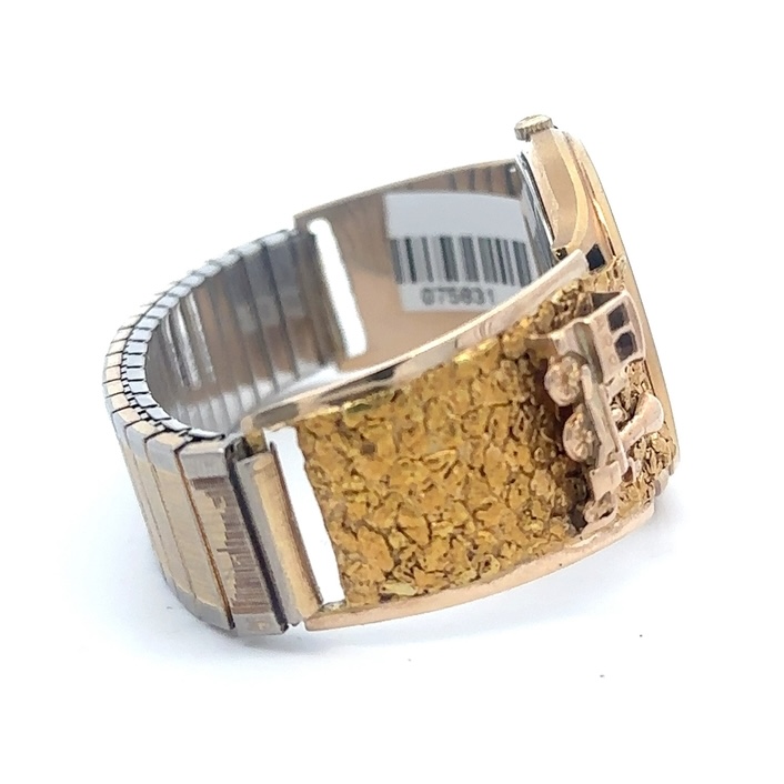 This gorgeous custom Hamilton masonic gold nugget watch is covered with Alaskan gold nuggets and is a nice, sleek design that is classy while not being too flashy or gaudy. It is nice and slim and has a low profile while you are wearing it. This watch face is on a nice stretch watch band. The inserts are fully covered in Alaskan gold nuggets & features a gold train on both sides.