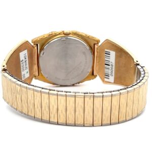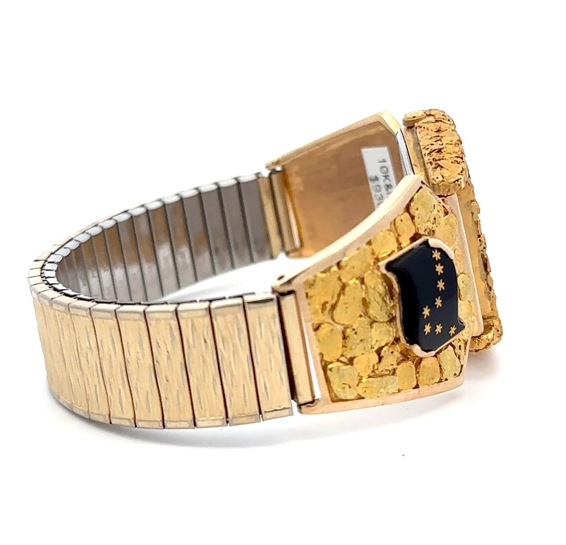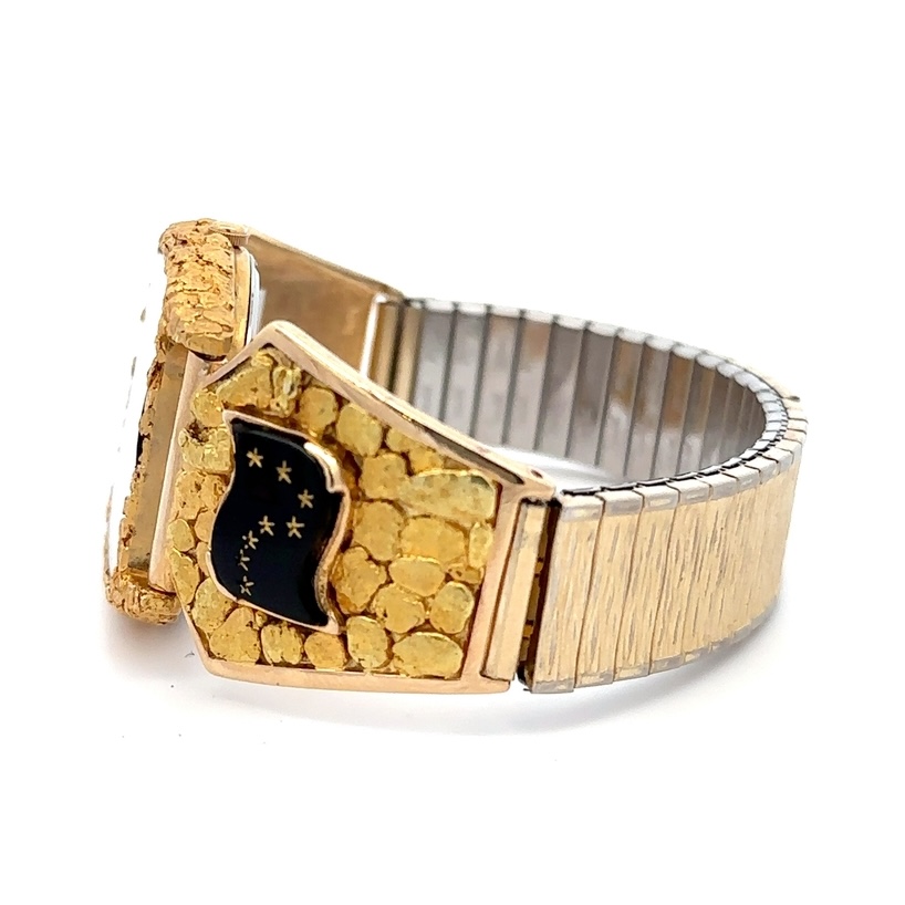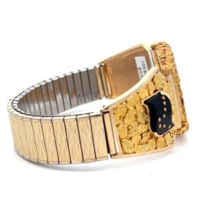This gorgeous Alaskan Seiko gold nugget watch is covered with Alaskan gold nuggets and is a nice, sleek design that is classy while not being too flashy or gaudy. It is nice and slim and has a low profile while you are wearing it. This watch face is on a nice stretch watch band. The inserts are fully covered in Alaskan gold nuggets and feature two black onyx Alaska flags.