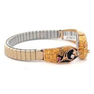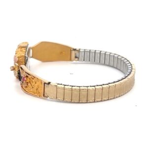 This gorgeous Alaskan Seiko gold nugget watch is covered with Alaskan gold nuggets and is a nice, sleek design that is classy while not being too flashy or gaudy. It is nice and slim and has a low profile while you are wearing it. This watch face is on a nice stretch watch band. The inserts are fully covered in Alaskan gold nuggets. It features diamonds and pink colored stones.