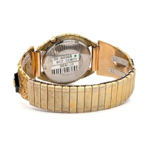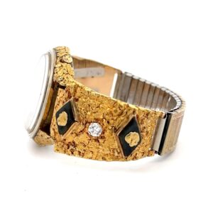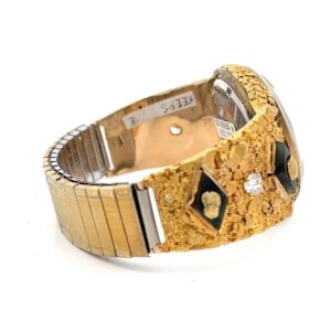 This gorgeous Alaskan Seiko gold nugget watch is covered with Alaskan gold nuggets and is a nice, sleek design that is classy while not being too flashy or gaudy. It is nice and slim and has a low profile while you are wearing it. This watch face is on a nice stretch watch band. The inserts are fully covered in Alaskan gold nuggets and feature four diamond-shaped jade pieces and cubic zirconia on both sides.