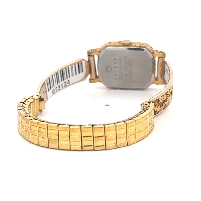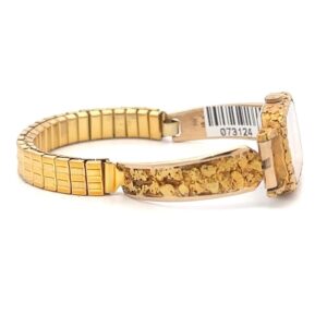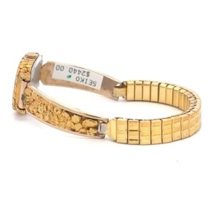 This gorgeous Alaskan Seiko gold nugget watch is covered with Alaskan gold nuggets and is a nice, sleek design that is classy while not being too flashy or gaudy. It is nice and slim and has a low profile while you are wearing it. This watch face is on a nice stretch watch band. The inserts are fully covered in Alaskan gold nuggets. The face of the watch features a solitaire diamond.