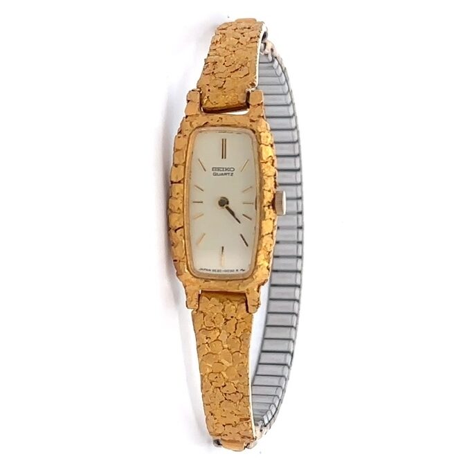 This gorgeous Alaskan Seiko gold nugget watch is covered with Alaskan gold nuggets and is a nice, sleek design that is classy while not being too flashy or gaudy. It is nice and slim and has a low profile while you are wearing it. This watch face is on a nice stretch watch band. The inserts are fully covered in Alaskan gold nuggets.