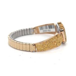 This gorgeous Alaskan Seiko gold nugget watch is covered with Alaskan gold nuggets and is a nice, sleek design that is classy while not being too flashy or gaudy. It is nice and slim and has a low profile while you are wearing it. This watch face is on a nice stretch watch band. The inserts are fully covered in Alaskan gold nuggets.