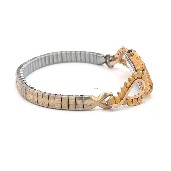 This gorgeous Alaskan Seiko gold nugget watch is covered with Alaskan gold nuggets and is a nice, sleek design that is classy while not being too flashy or gaudy. It is nice and slim and has a low profile while you are wearing it. This watch face is on a nice stretch watch band. The inserts are fully covered in Alaskan gold nuggets.