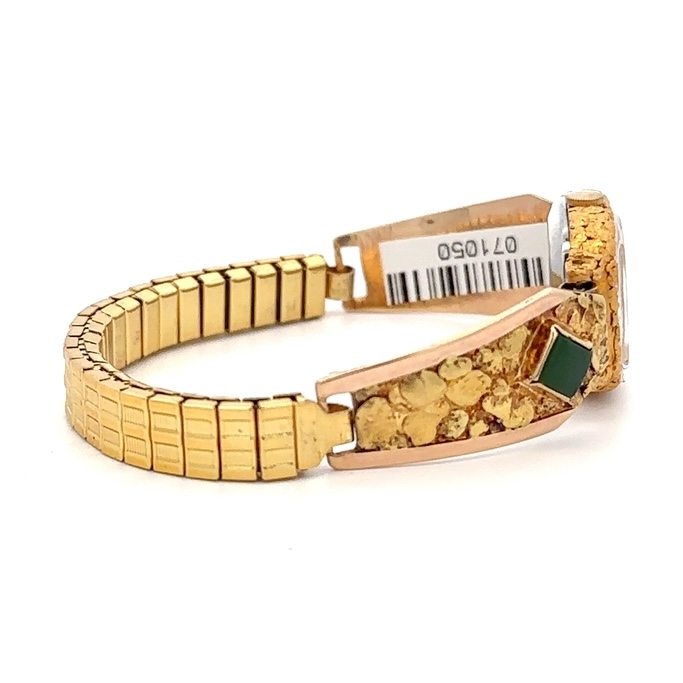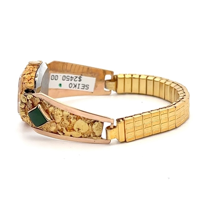 This gorgeous Alaskan Seiko gold nugget watch is covered with Alaskan gold nuggets and is a nice, sleek design that is classy while not being too flashy or gaudy. It is nice and slim and has a low profile while you are wearing it. This watch face is on a nice stretch watch band. The inserts are fully covered in Alaskan gold nuggets and features diamond-shaped jade pieces on each side of the inserts.