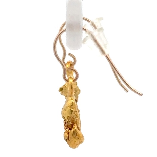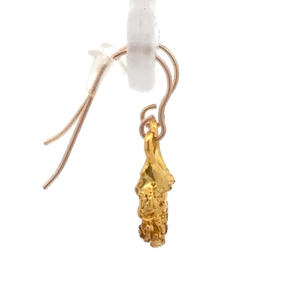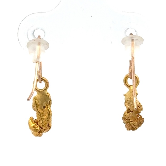 These dangling gold nugget earrings are expertly crafted with natural gold nuggets carefully placed and soldered onto 14k yellow gold setting. Because we are using natural gold nuggets, each pair of earrings are one-of-a-kind. The earrings measure 8mm tall.