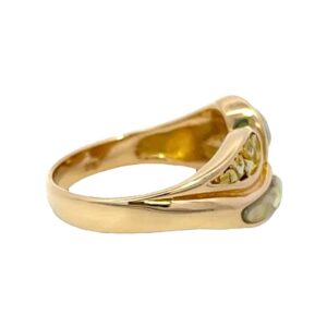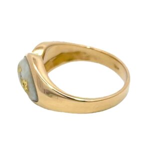 The ring features a natural gemstone known as “Gold Bearing Quartz,” typically mined from deep underground. In most cases, gold found in quartz exists in microscopic amounts, making it virtually invisible. However, this ring boasts an extraordinary rarity as it showcases a very scarce stone that is first cut into slabs, revealing the precious gold vein. Subsequently, skilled artisans cut, shape, polish, and mount it into a 14k gold setting. Embrace the allure of this remarkable Gold Bearing Quartz ring and celebrate the natural beauty of this exceptional gemstone.