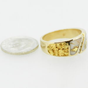 The ring features a natural gemstone known as “Gold Bearing Quartz,” typically mined from deep underground. In most cases, gold found in quartz exists in microscopic amounts, making it virtually invisible. However, this ring boasts an extraordinary rarity as it showcases a very scarce stone that is first cut into slabs, revealing the precious gold vein. Skilled artisans cut, shape, polish, and mount the gold quartz into a 14k gold setting. Embrace the allure of this remarkable Gold Bearing Quartz ring and celebrate the natural beauty of this exceptional gemstone.