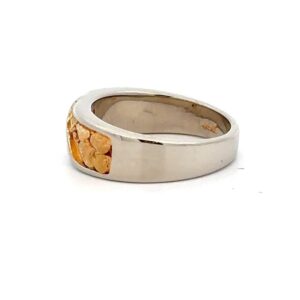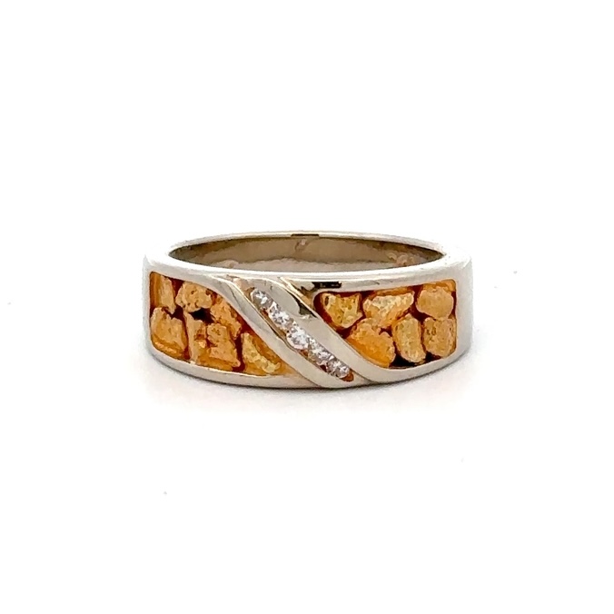 This diamond & gold nugget white gold ladies ring is expertly crafted with natural gold nuggets carefully placed and soldered into 14k white gold. Because we are using natural gold nuggets, each ring is one-of-a-kind. The ring also features a row of 5 natural diamonds.