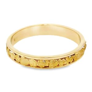 This 4mm men’s gold nugget ring is expertly crafted with natural Alaskan gold nuggets carefully placed and soldered onto a 14k yellow gold band. Because we are using natural Alaskan gold nuggets, each ring is one-of-a-kind.