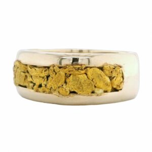 This handsome gold nugget white gold men’s ring is expertly crafted with natural gold nuggets carefully placed and soldered onto a 14k white gold band. Because we are using natural gold nuggets, each ring is one-of-a-kind. The ring is about 10.5mm wide and weighs 21 grams. Mark, the jeweler, makes many of his rings in a square shape, which is more comfortable than the traditional round shape for many men. Ring size 12.5. Due to the shape of the ring, it can only be sized larger or smaller about 1 size, otherwise we can make a new one in your correct size, please contact us for a quote.
