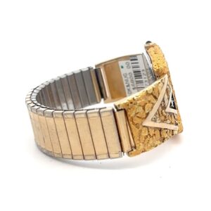 This gorgeous Alaskan Seiko gold nugget watch is covered with Alaskan gold nuggets and is a nice, sleek design that is classy while not being too flashy or gaudy. It is nice and slim and has a low profile while you are wearing it. This watch face is on a nice stretch watch band. The inserts are fully covered in Alaskan gold nuggets and features a diamond on either side.