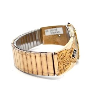 This gorgeous Alaskan Seiko gold nugget watch is covered with Alaskan gold nuggets and is a nice, sleek design that is classy while not being too flashy or gaudy. It is nice and slim and has a low profile while you are wearing it. This watch face is on a nice stretch watch band. The inserts are fully covered in Alaskan gold nuggets and features diamonds on either side.