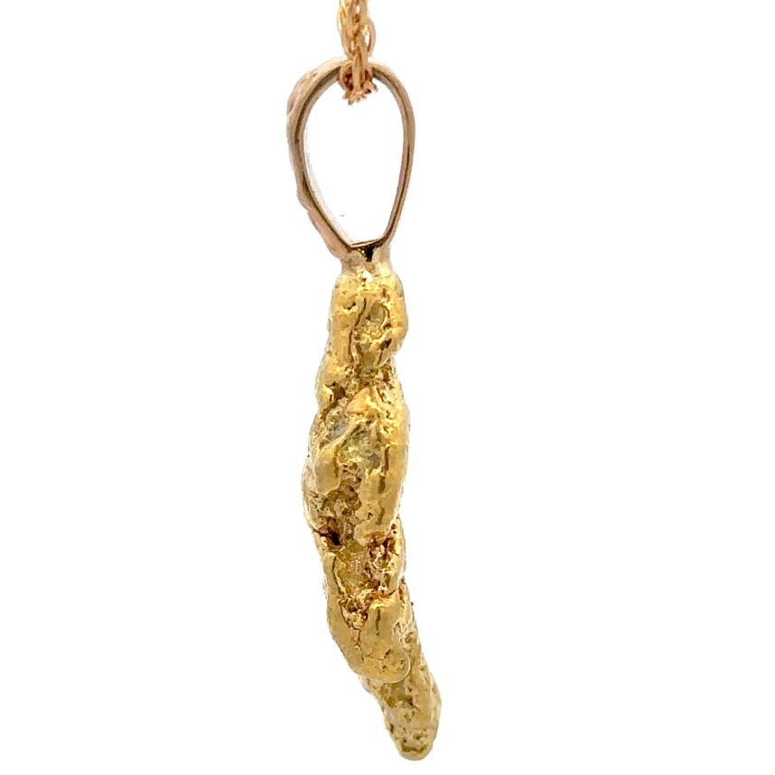 This nugget pendant features a custom made 14k gold bale that is custom fit to the nugget. The total weight is 10.5 grams and is 40mm tall including the bale and is 12mm wide. This gold nugget is a one of a kind pendant. It will definitely be conversation starter and comes with 14k gold-filled chain.