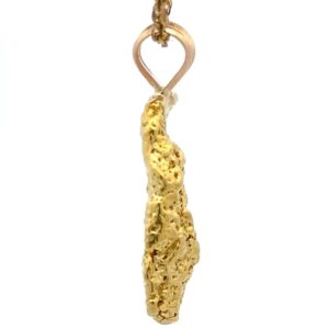 This nugget pendant features a custom made 14k gold bale that is custom fit to the nugget. The total weight is 10.8 grams and is 33mm tall including the bale and is 18mm wide. This gold nugget is a one of a kind pendant. It will definitely be conversation starter and comes with 14k gold-filled chain.