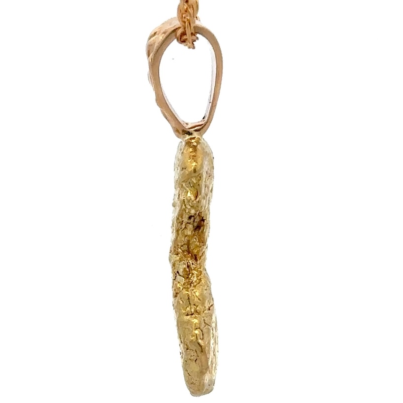 This nugget pendant features a custom made 14k gold bale that is custom fit to the nugget. The total weight is 11.6 grams and is 34mm tall including the bale and is 18mm wide. This gold nugget is a one of a kind pendant. It will definitely be conversation starter and comes with 14k gold-filled chain.