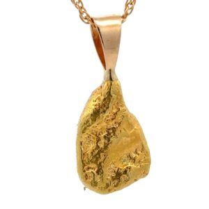 This nugget pendant features a custom made 14k gold bale that is custom fit to the nugget. The total weight is 14.4 grams and is 34mm tall including the bale and is 14mm wide. This gold nugget is a one of a kind pendant. It will definitely be conversation starter and comes with 14k gold-filled chain.
