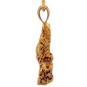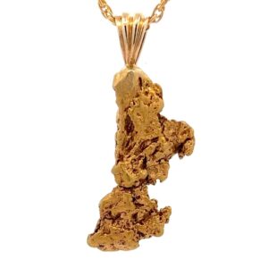 This nugget pendant features a custom made 14k gold bale that is custom fit to the nugget. The total weight is 15.5 grams and is 40mm tall including the bale and is 13mm wide. This gold nugget is a one of a kind pendant. It will definitely be conversation starter and comes with 14k gold-filled chain.