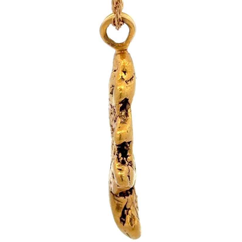 This nugget pendant features a custom made 14k gold bale that is custom fit to the nugget. The total weight is 21.4 grams and is 41mm tall including the bale and is 18mm wide. This gold nugget is a one of a kind pendant. It will definitely be conversation starter and comes with 14k gold-filled chain.