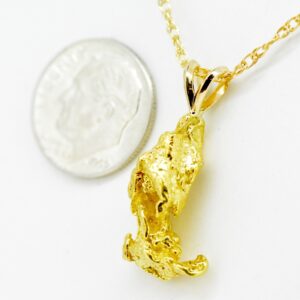 This 3.0 DWT Alaskan gold nugget pendant weighs 3.0 DWT and features a classic 14k split bail. The pendant comes with a gold plated chain in a nice box. It shows up ready to give to someone special, even if that special someone is you.